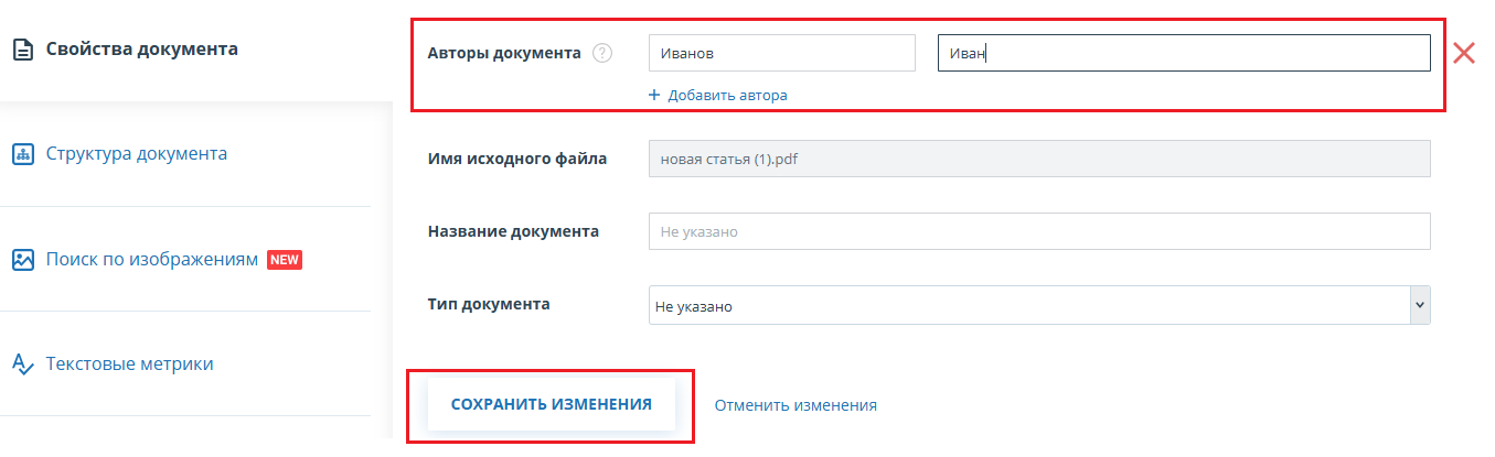 Если система не извлекла (или извлекла некорректно) ФИО автора документа, то в этом случае, предусмотрена возможность отредактировать автора документа вручную. Для этого выберите в Кабинете интересующий документ и напротив него нажмите "Посмотреть результаты". Далее в свойствах документа нажмите на "Редактировать". После этого внесите автора работы. Если работа писалась в соавторстве, то можно указать до 20 авторов. После внесения данных сохраните изменения.