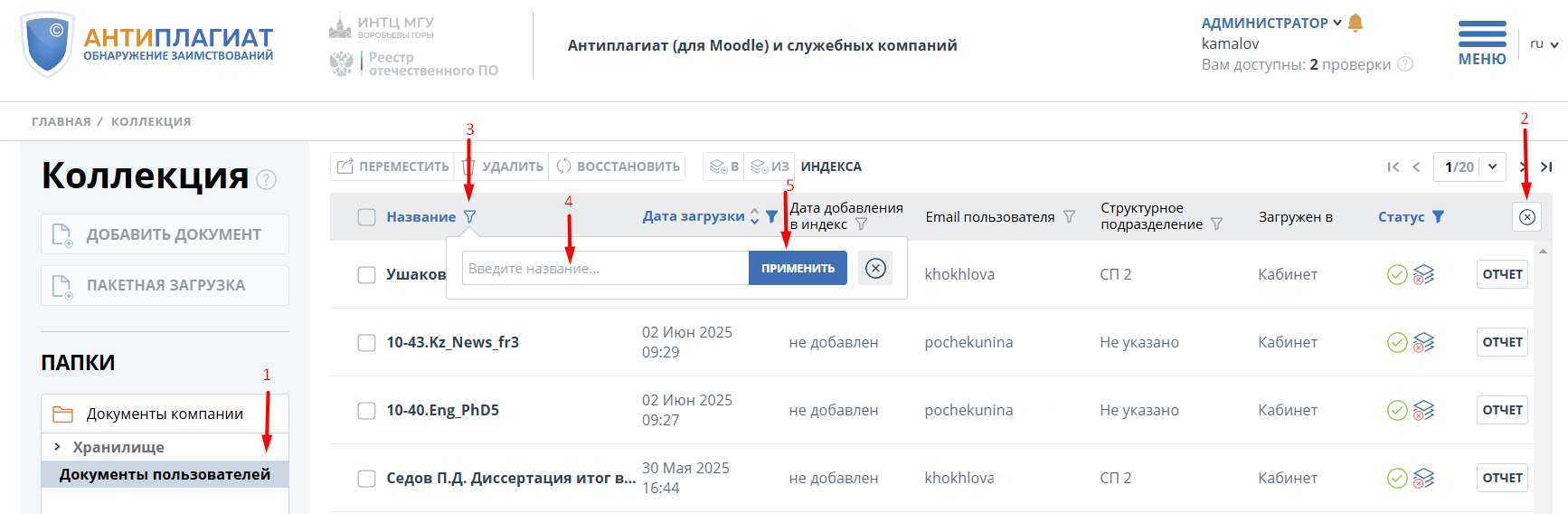 По вопросу удаления документа из индекса в корпоративной версии системы "Антиплагиат" вам необходимо обратиться к Администратору системы в вашем ВУЗе через форму обращения на странице "Контакты" в разделе "Контакты администратора системы "Антиплагиат" в вашей организации".