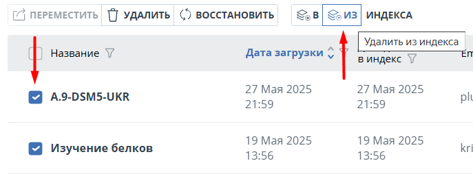 7. После того, как система найдет документ, выделите его галочкой и нажмите кнопку "Удалить из индекса".